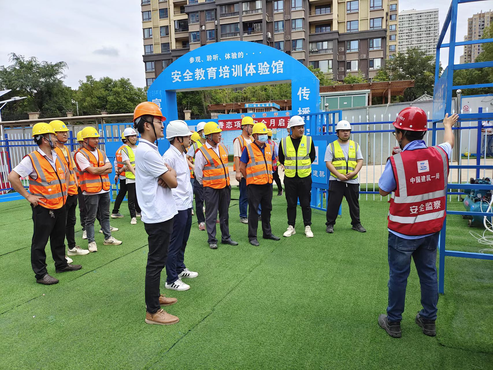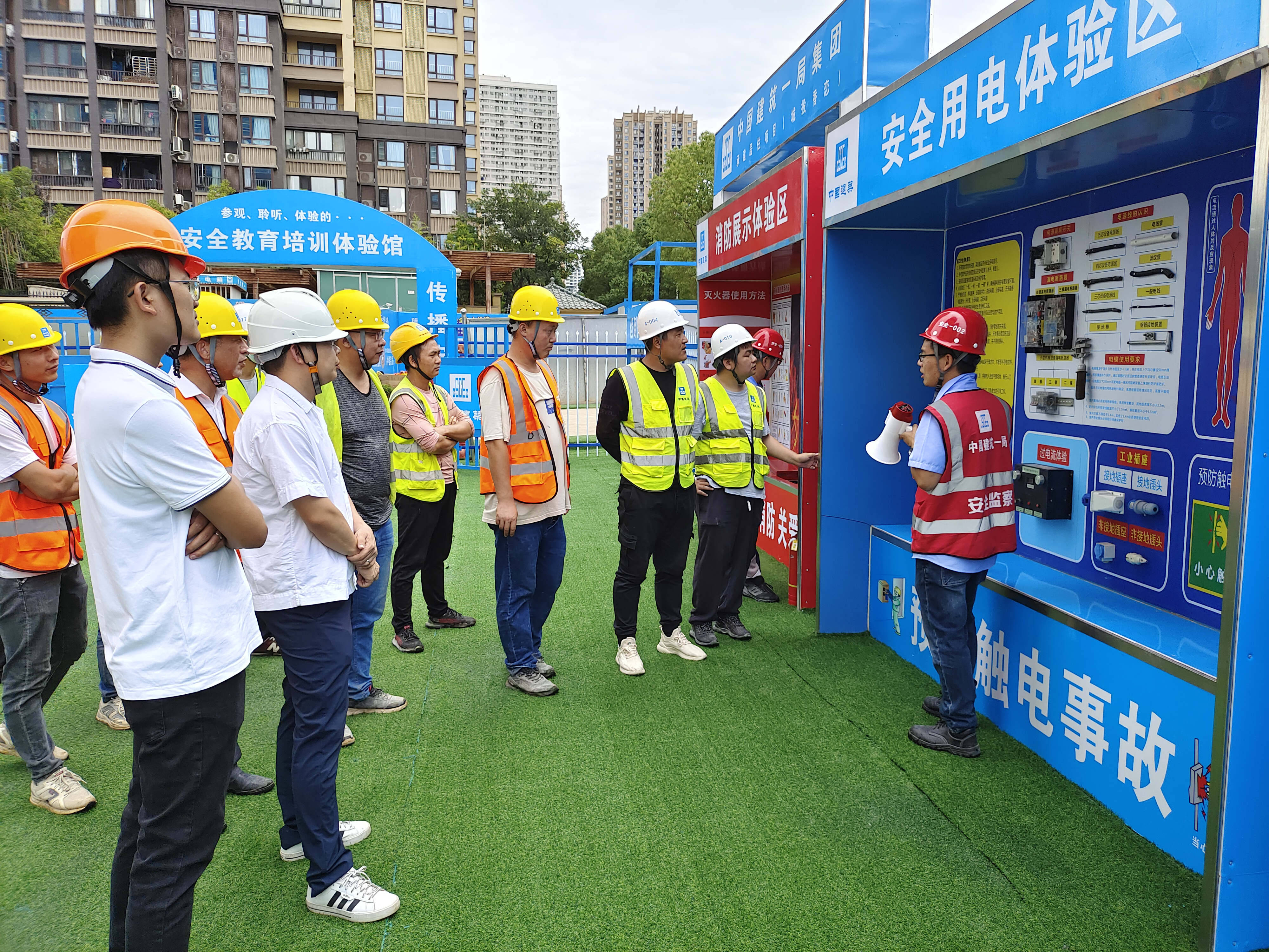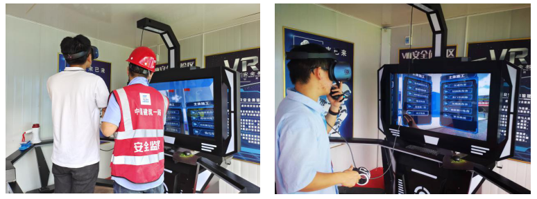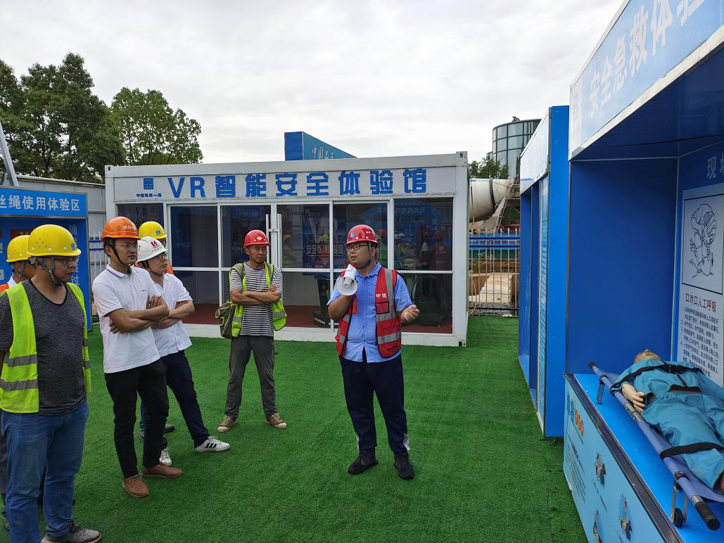 在项目现场新建的建设安全教育培训体验馆内设置了安全用电体验区、消防展示体验区、倾倒体验区、安全急救体验区、VR智能安全体馆等多种区域。这些体验区都是根据项目现场最容易出现安全隐患的真实场景量身定制,每一个环节的巧妙设计,例如:高空作业体验区,体验者需要切身体验的是高空作业情况下安全绳的规范使用,根据要求,安全绳应该捆于腰间,如果捆绑方式不规范,失足发生意外时,安全绳就不能起到很好的保护作用。