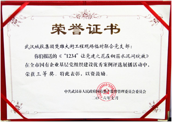 《“1234”让党建之花在钢筋水泥间绽放》记录了公司雄楚大街工程现场临时联合党支部,在2015年二环线430和830攻坚战中,通过统一行动纲领、形成二元合作机制、实行三个同步、抓好四条主线工作等做法,将现场党员凝聚起来,将现场骨干带动起来,形成一股强大的“合力”,将基层党组织政治优势转化为项目建设的管理优势,推动党建融入中心工作、对接重点工程,真正体现党组织服务基层、服务群众、服务大局的宗旨,发挥基层党组织的战斗堡垒作用。
