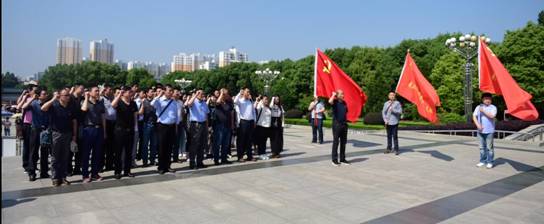 在烈士纪念碑前,全体党员干部统一佩戴党徽,向革命烈士敬献花篮、列队肃立默哀,行三鞠躬,并面向鲜红的党旗,坚定地举起右拳,重温入党誓词“我志愿加入中国共产党,拥护党的纲领,遵守党的章程,履行党员义务,执行党的决定,严守党的纪律……”