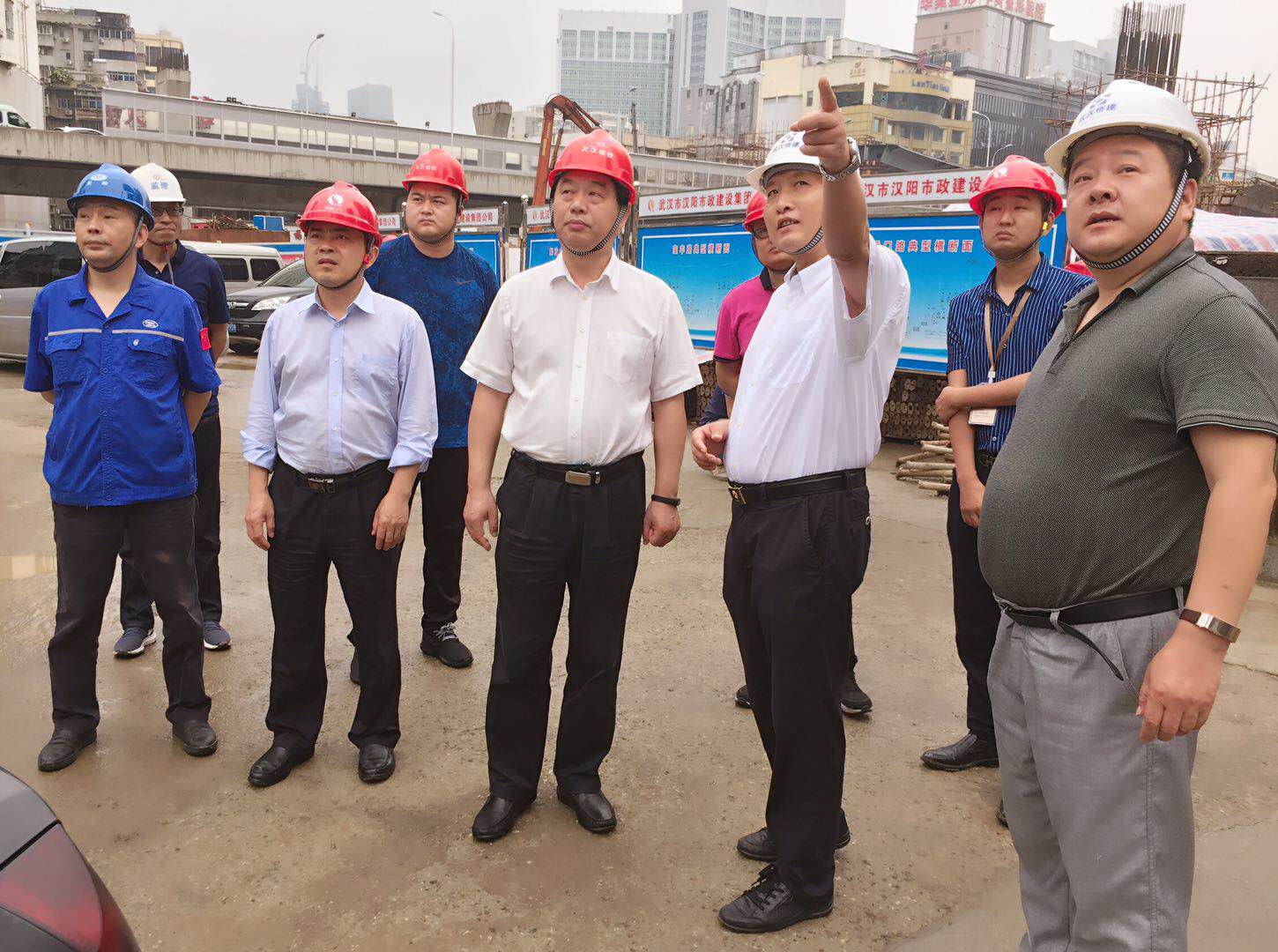 在宝丰路现场,金董事长详细查看了宝丰路高架四层立交的进展情况,并就工程的下步工作提出了具体要求。金总在检查中指出,汉江大道是军运会配套项目,交通意义重大,一定要严格按照施工方案加快推进工程建设,并同相关单位做好沟通协调工作,确保按期完工通车。