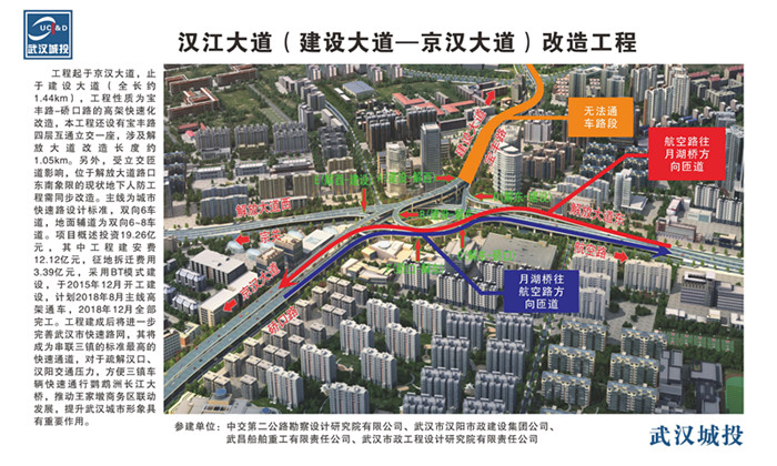 整个汉江大道工程是常青路-硚口路-江汉四桥快速通道,为武汉主城区快速路的重要组成部分,南接南三环,北至北三环并与机场高速连接。