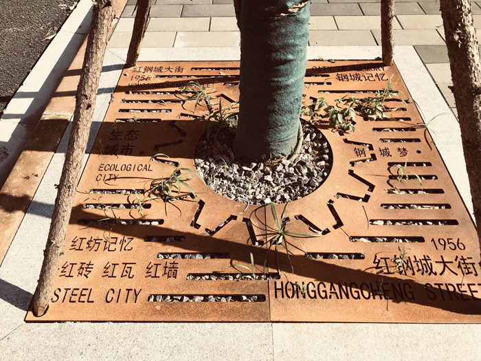 经过整治提升后的,红钢城大街全线拓宽为双向六车道。人行道上采用砖红色的耐候钢包边站石,行道树的树穴采用刻有“红坊记忆”“红砖、红瓦、红墙”等字样的耐候钢板篦子,就连垃圾桶、车挡等都是采用“工业风”轴承外形,从制作、材质上都彰显出“钢城文化特色”。人行道上的坐凳采用芝麻黑花岗岩雕刻,石材表面刻有齿轮、轴承、扳手、锤子等工业图案,坐凳面层采用芬兰防腐木。人行道上铺设了透水砖,能“吃”进雨水。道路两侧绿化带和人行道行道树选用了无患子、巨紫荆、乌桕等树种。秋天来临时,这些树木的叶子将变成红色,烘托红钢城独特的文化气息,成为名副其实的一条生态景观廊道。
