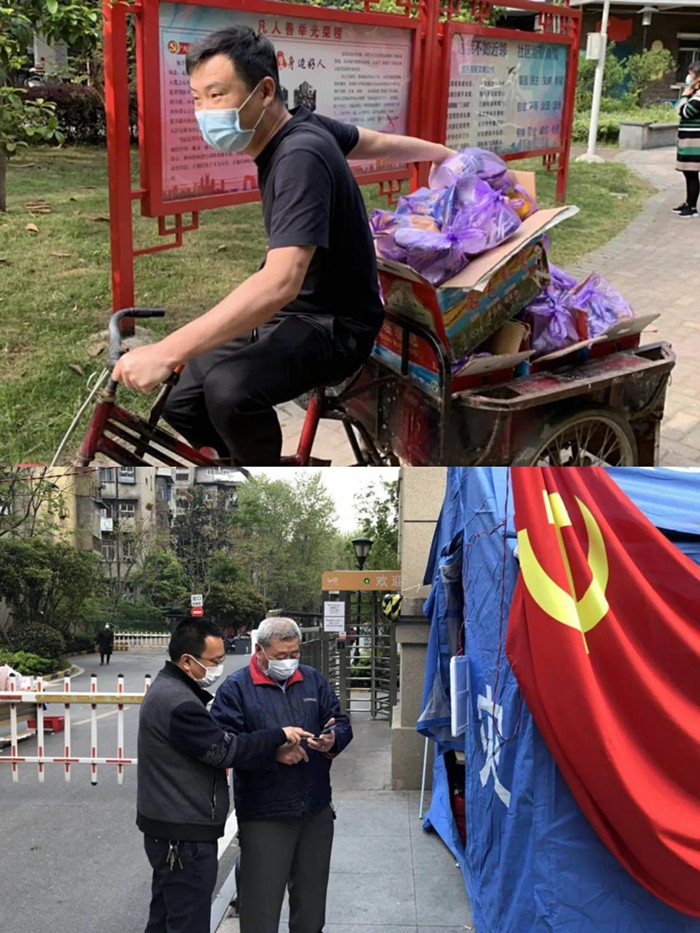 (下沉人员为居民运送物资,耐心指导居民扫码)
