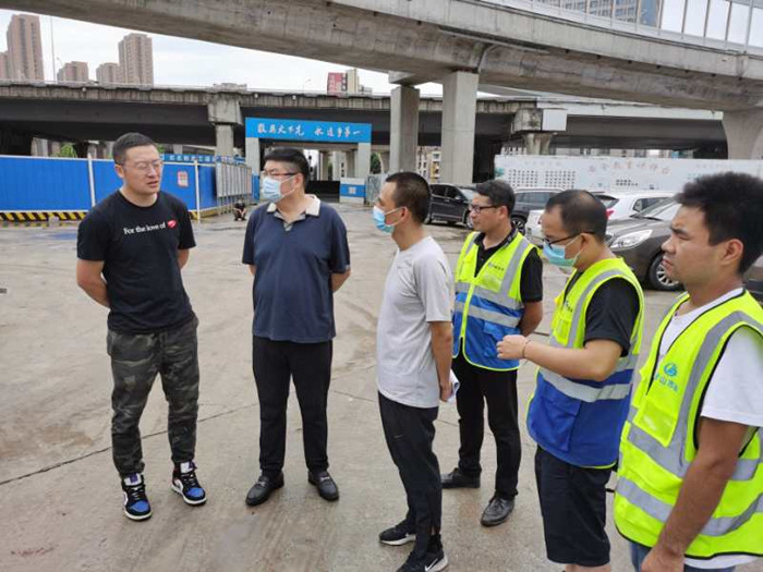 7月12日上午,市城投集团副总经理林驰在杨泗港青菱段集结点检查市级防汛抢险大队城投中队第一尖刀分队防汛应急工作情况。
