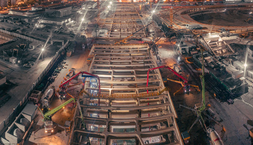 4月18日下午15时30分,该工程开始实施车站段主体结构底板混凝土浇筑。为确保基坑施工安全和工程质量,整个车站段结构底板共分为7仓,采用跳仓施工方式率先对底板第2仓进行浇筑。该仓长36米,宽43米,浇筑混凝土总量约3680立方,于4月19日下午16时30分浇筑完成。明挖区间段的首仓浇筑也紧接于4月21日开始浇筑,并于4月22日下午顺利完成。
