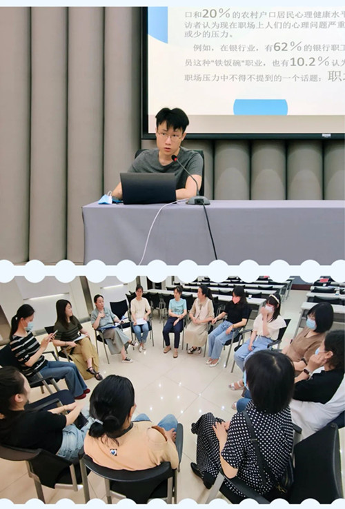 在区卫健局和唐家墩街道的大力支持下,活动邀请武汉市优抚医院的2位专家进行授课。郑文荃老师重点讲授了职场人际关系处理,帮助职工识别和应对不良情绪,缓解职场焦虑。汪锐老师带领职工开展团队互动解压游戏,通过小组讨论、自我解析、冥想放松训练等环节,引导职工进行有效沟通,科学疏导心理压力。