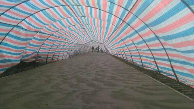 4月份,项目部进行了相当一部分沥青铺设和大量的Fr5.0钢筋混凝土浇筑,现场生产如火如荼。但是,武汉在这一时间段内也进入雨季,连日的大雨给施工带来了非常不利的影响,给沥青摊铺和混凝土浇筑造成了严重的阻碍。在这种天气下,项目部决策果断,下令制造雨棚,保证混凝土及时养护,也给现场作业提供了宝贵的时间也给项目按期完工提供了有力保障。
