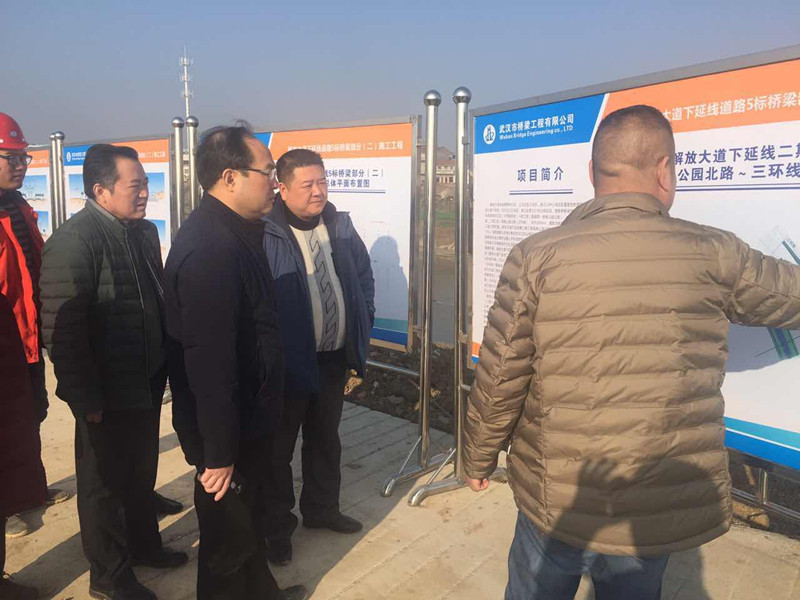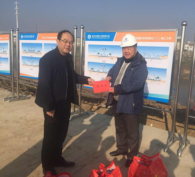 1月26日上午,市城投集团公司领导汪国圣一行来到我公司负责代建的解放大道下延线工程现场,为春节期间仍坚守在工作岗位上的工程建设者送去新春的祝福和节日的问候,并送去慰问金和节日物资。