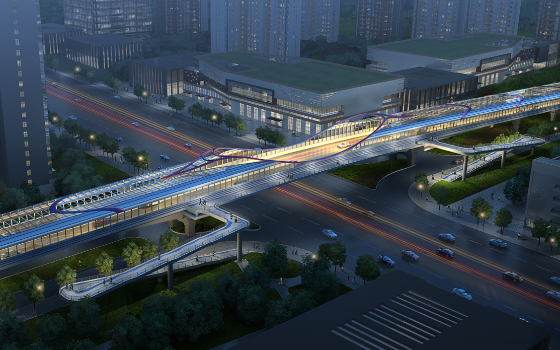 沙湖大道(秦风路—杨园南路)跨徐东大街立交,主线桥长约475米,两端桥梁引道长约220米,设计车速40km/h,桥宽16.5—20.5米,是一座人行、非机动车过街天桥和跨线高架桥结合的功能桥,将市政高架桥与人行过街天桥有机结合,满足车行、人行及非机动车基本过街需求,桥梁景观设计将流畅的蓝色曲线与桥梁声屏障有机融合。主线桥梁动感、优美的蓝色曲线,与声屏障韵律感构架融为一体,可以减少驾驶员的视觉疲劳,增添视觉美的体验感和冲击力,这些特色算得上国内首创一举。