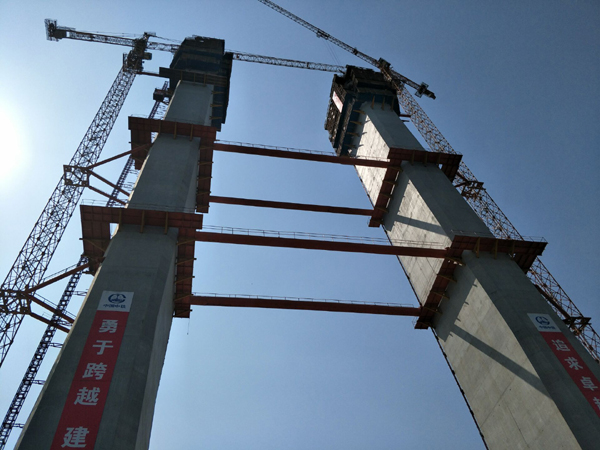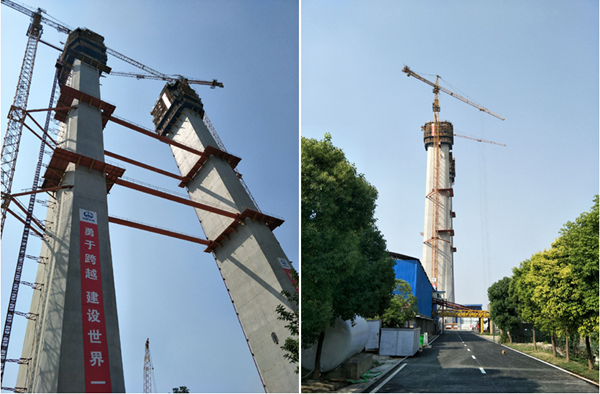 1#塔位于汉阳侧江滩边,主塔基础为沉井基础,主塔施工共分38节,计划于2017年底封顶。